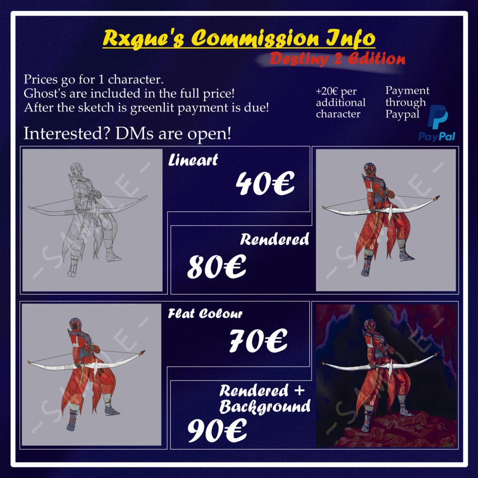 Mainly I offer Destiny 2 commissions, but other fandoms or original characters are also up my alley. Up above you see illustrations, stickers and a YCH (in this case, "Your Guardian here").